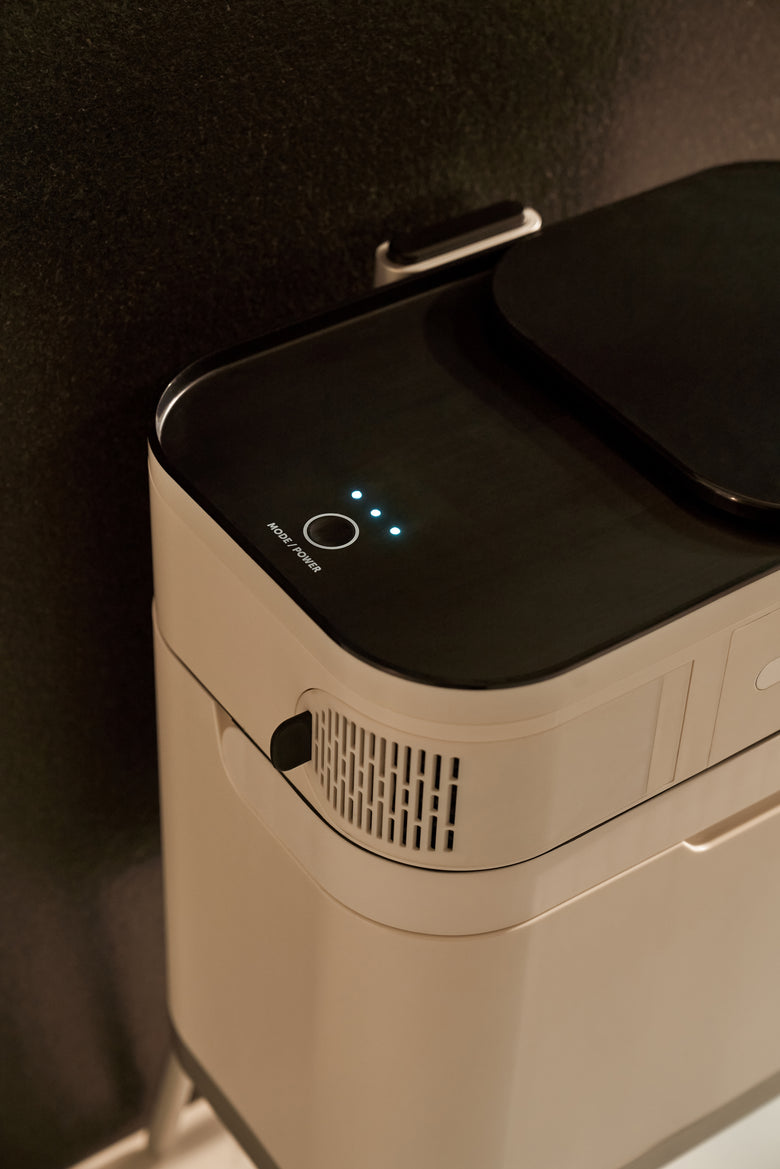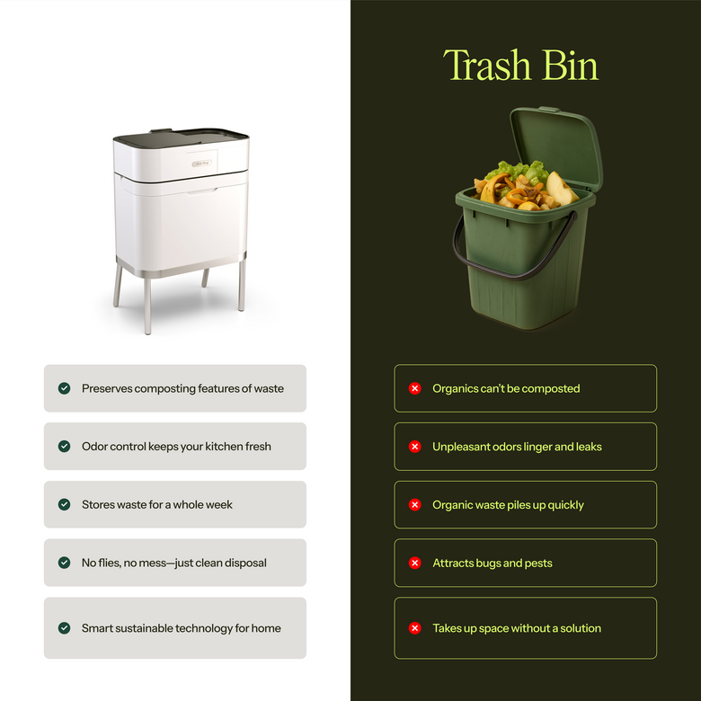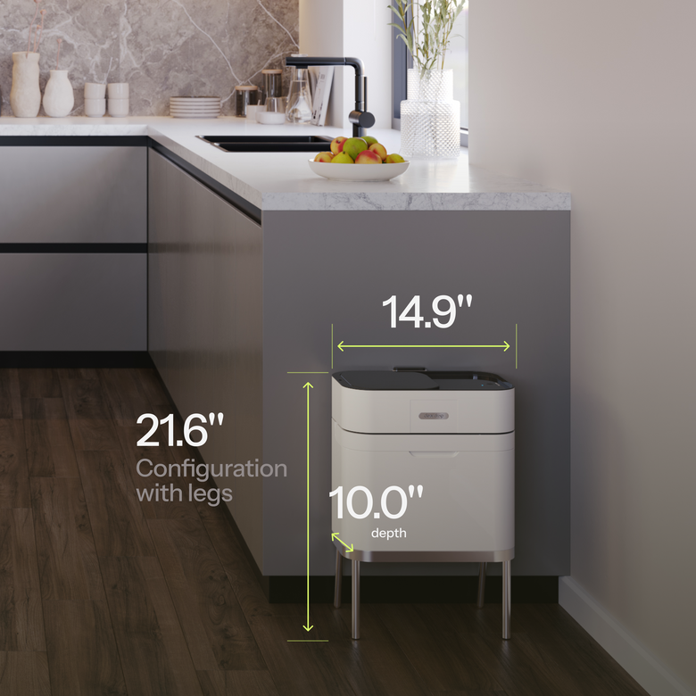 The Organics Collector is not a composter but a low-power device that makes collecting and storing organics at home easy and convenient. It keeps organic waste from developing an unpleasant odor, for roughly one week, eliminating the need for frequent removals.