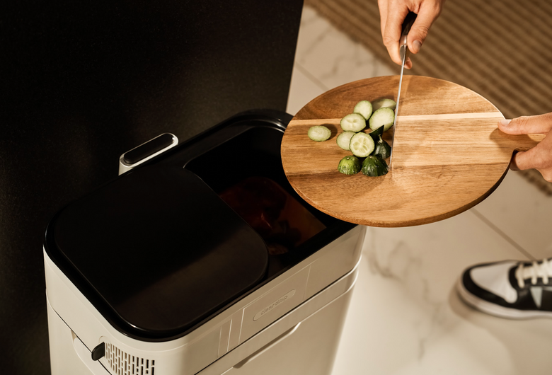 From a plate or cutting board, add your organic waste to the bin. The cover will automatically slide to the side and back to allow for processing.