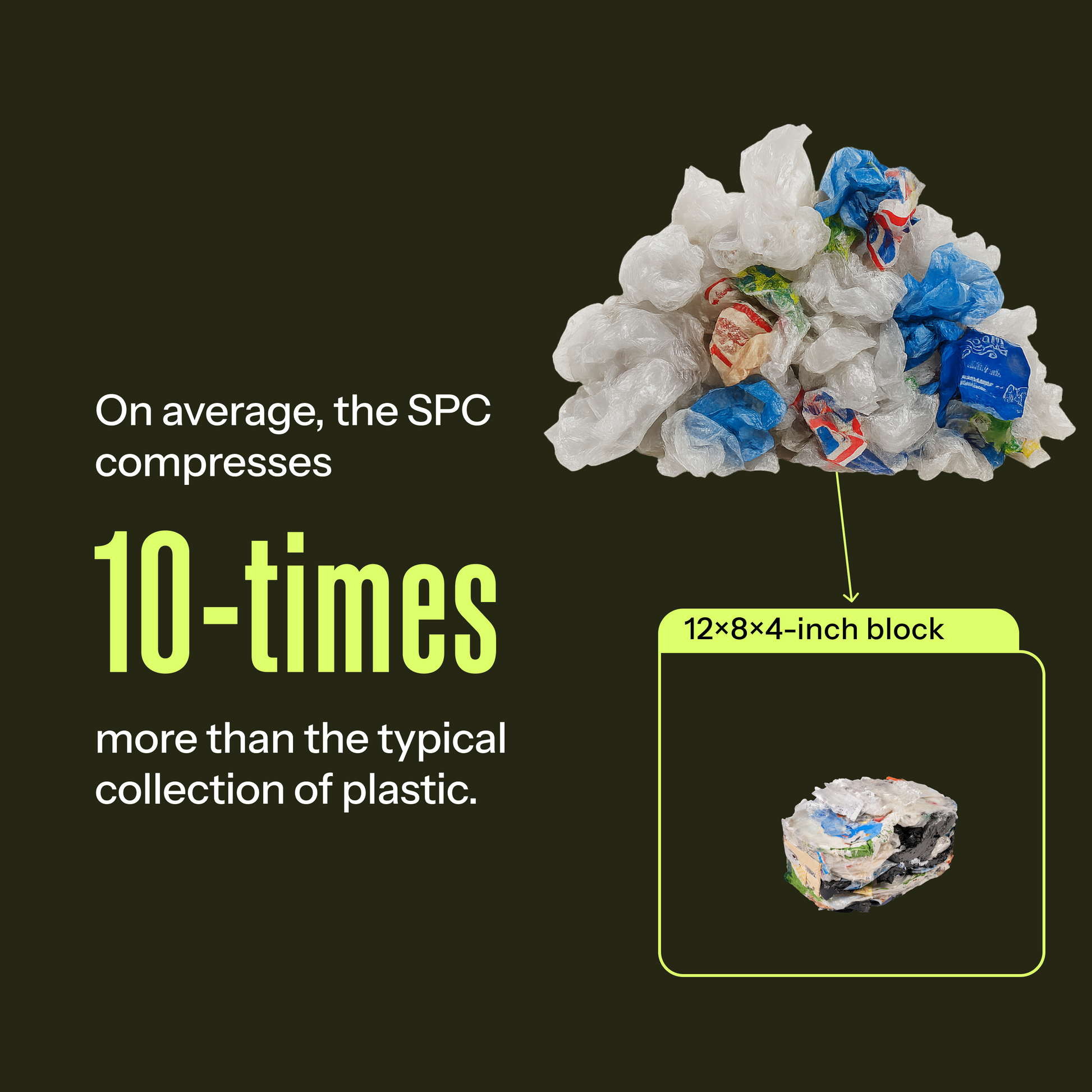 The SPC turns unmanageable plastic waste into compacted blocks that recyclers can more easily handle. It eliminates the need for sorting or drop-off trips, making it easy for households to take part in the circular economy.